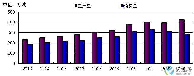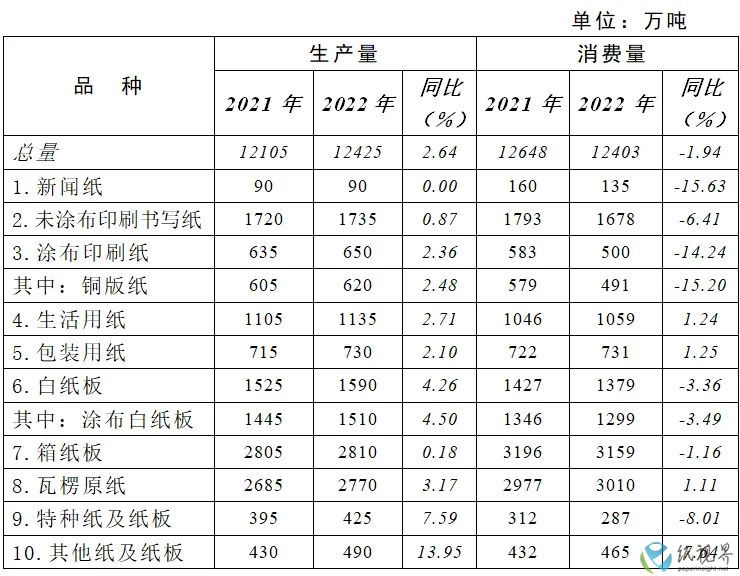 图1 2013年~2022年纸及纸板生产和消费情况 表1 2022年纸及纸板生产和消费情况